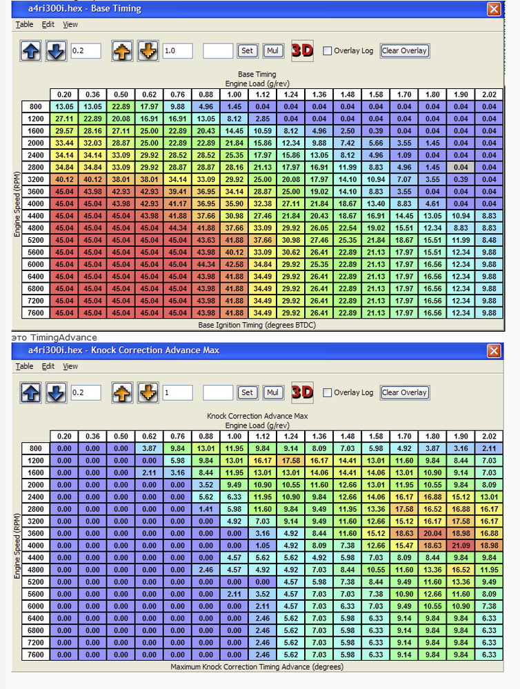 owl, стандартная таблица нужна всегда, если планируешь корректировать карту под свои условия (было бы чем), так несоизмеримо легче, поверь, писать карту с ноля, гораздо сложнее. Выложенная карта похожа на субаровскую, там очень оптимистичные базовые углы, в расчета на обучение по ретарду и адвансу. У меня на ММС несколько иначе, базовая карта сделана чрезмерно безопасно, в зоне наддува, как по зажиганию, так и по смеси, обучения по адвансу и ретарду нет, есть только ретард по превышению допустимого уровня детонации.