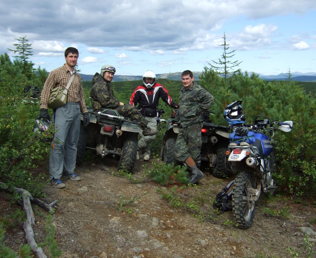 Съездили. Было 3 мотоцикла и 2 квадра. Дорога почти везде нормальная, уклоны только крутые и каменистые, но не чересчур. Воды немного, дорога скорее сухая, чем мокрая. В одном месте, похоже, блуканули и поломили в объезд под сопкой 742, поднялись там до 550м по стланику, каменюкам и корягам, потом спускались -- а скорей всего там можно было и попроще дорогу найти. На подъезде к Дукче-реке заболоченные поля неслабые, квадр один засадили, когда спасались -- еще и один мот (ехал последним по размолоченному и сел так, что колеса не видно было). Вокруг болот нашелся объезд. Выехали у моста Снежинского. Можно было и прямо на Снежку выехать -- в том районе дорог уже много.