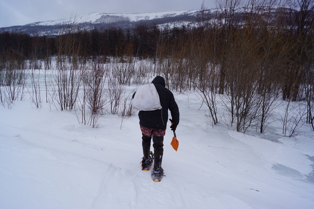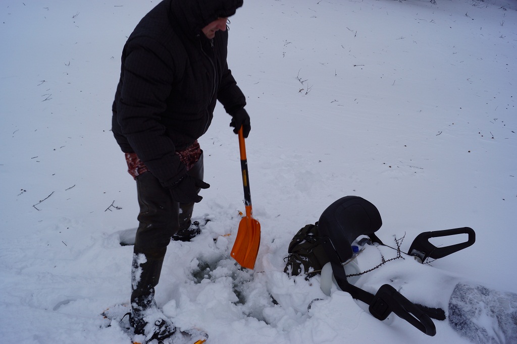 рыбацким буром забуриваемся в лед впереди снежика, бревно в лунку,
