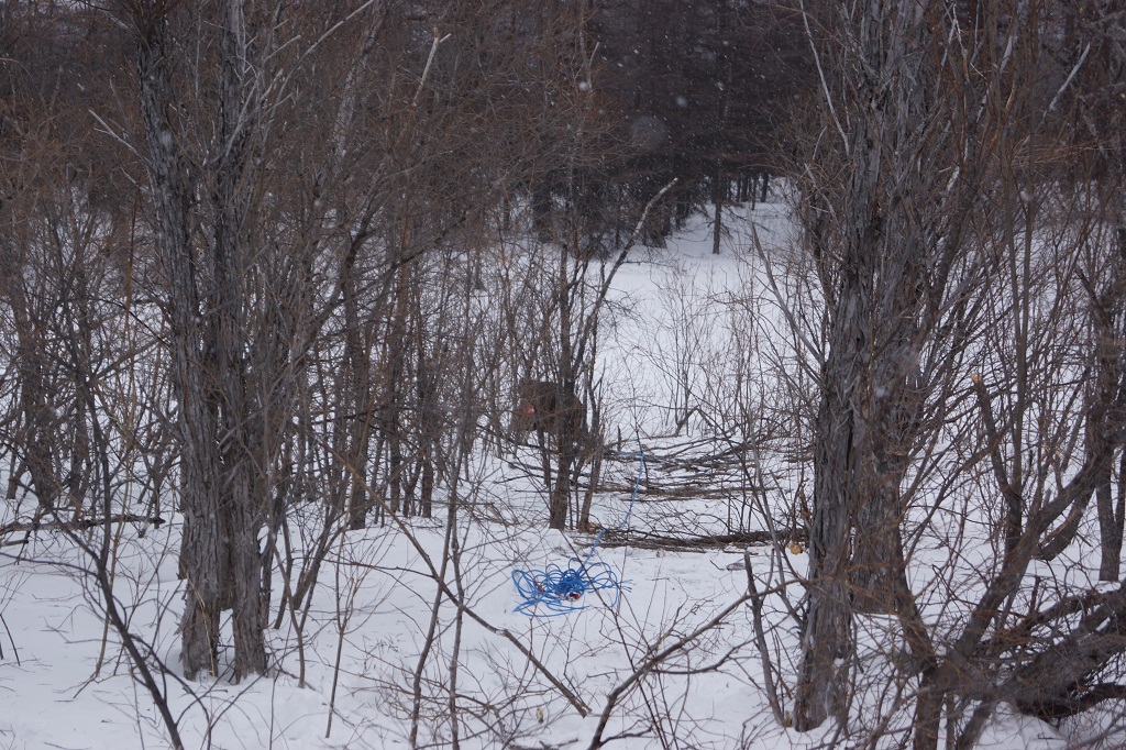 Нажмите для просмотра прикрепленного файладалее мы вырубили просеку, натянули веревки, и стали тащить лебедкой снегоход,