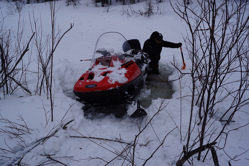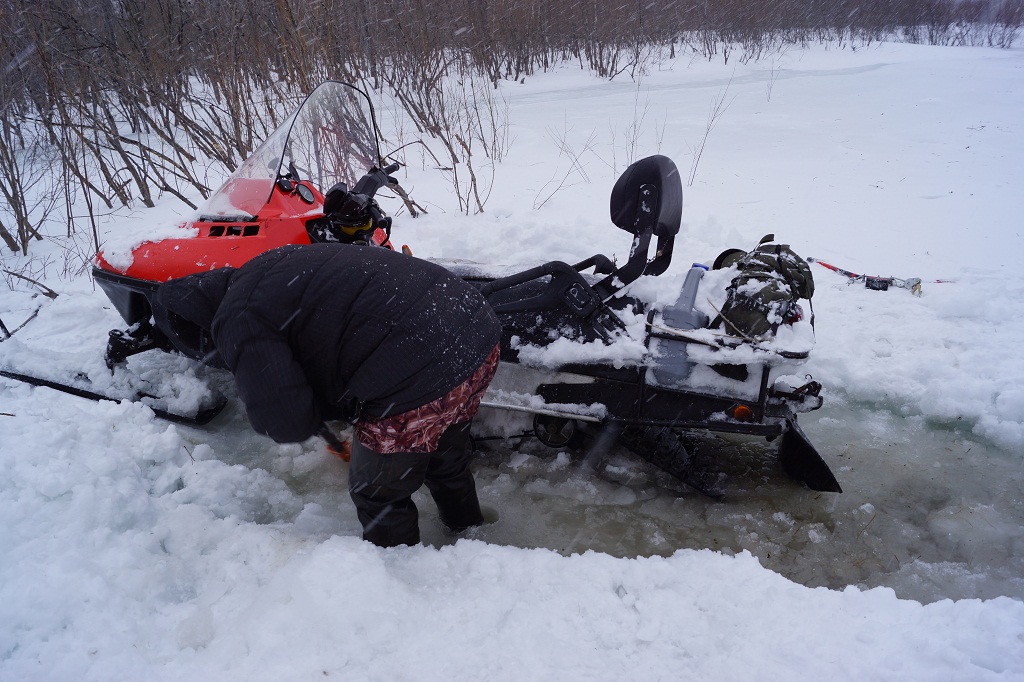 Дим надо ставить твой снегоход на сопке возле ближайщего дерева вязать снеж к нему устанавливать лебёдку спереди, брать пару хороших досок под гуску и тащить чтоб морда кота не провалилаь поперёк майны под лыжи тоже доску длинную одну через две лыжи выйдет .