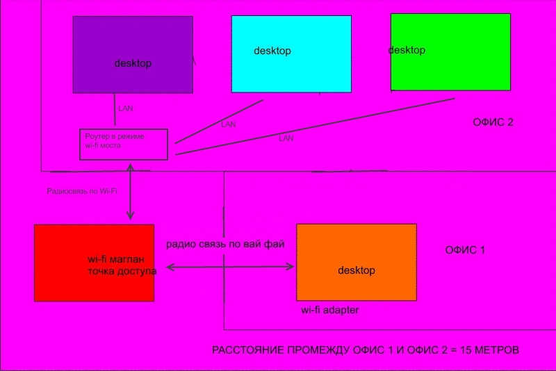 Нажмите для просмотра прикрепленного файлаВообще не пойму что мешает оборудовать офис 1 простым Wi-Fi USB свистком и цепляться им к Wi-Fi Маглана, а Офис 2 простым роутером (режим беспроводного моста) и кормить с него сетью десктотпы по проводам?