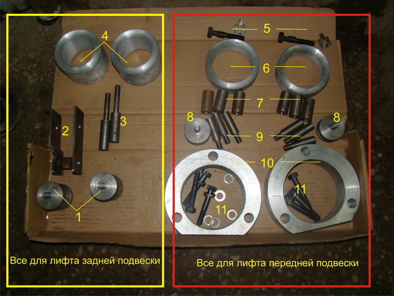 7- 11- Втулки и болты для подьёма на необходимую высоту поперечной балки между передними стойками. (находится под капотом и не увсех «круглых» она стоит) А если стоит, то после лифта она опускается прямиком на движку. Поднимать распорку не приходится тем, кто вместо проставок под передние стойки выточил удлинители штока передних стоек.
