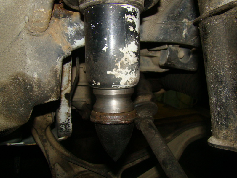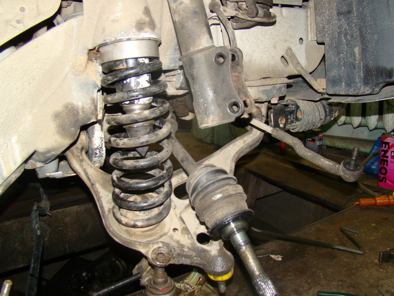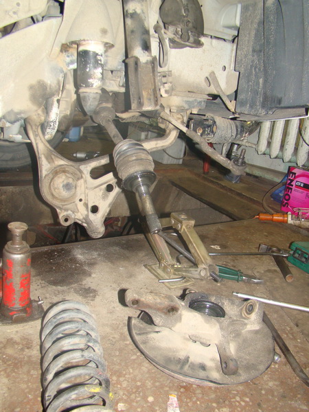 Я начал с передка. Перво – наперво ослабиваем все салейнблоки как с переди, так и с зади (чтобы не забыть) ... откручиваем тягу стабилизатора от ступиц, домкратим и ... снимаем колесо, откручиваем супрта, рулевую, снимает стопорное кольцо с привода.... А теперь... подставляем один домкрат под нижний рычаг (хорошо ставим!!!) и откручиваем гайку с шаровой и два болта со стойки... Аккуратно !!!!! очень аккуратно опускаем домкрат и обновремено вытягиваем гранату привода из ступицы. В самом конце (низу) граната выйдет со шлицов и одновремено выпадет из щаровой нижнего рычага. Опускаем дальше домкратом и пружина выпадает. Всё.
