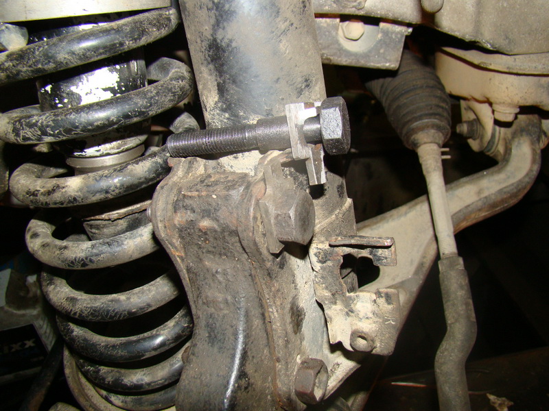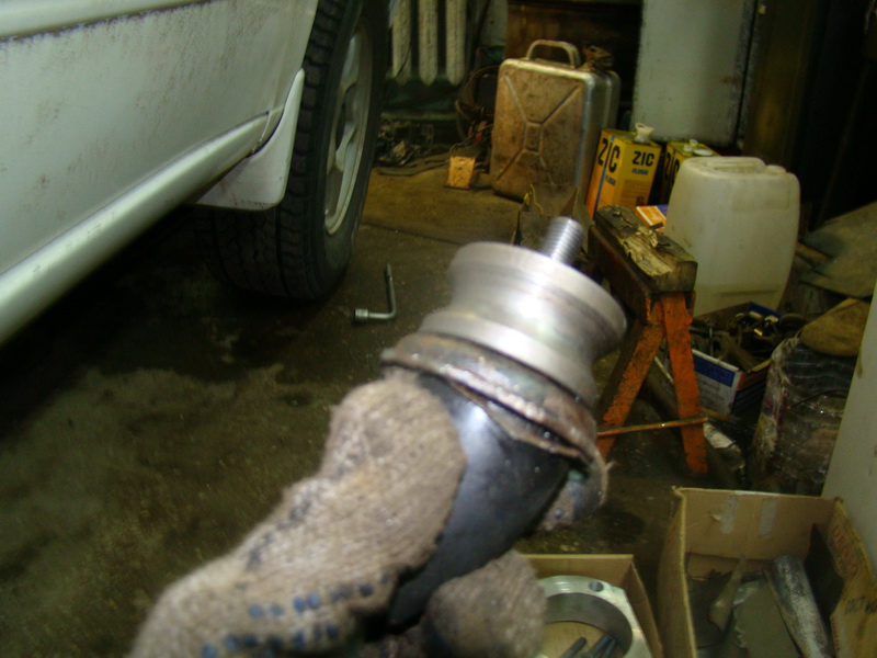 Далее... вставляем стойку в ступицу и крепим: нижний болт с гайкой родной, а вот верхний с эксцентриком № 5 и спец-шайбой (котрую надо немного подогнать на шлифовальном станке) . Эксцентрики дают возможность регулировать развал в диапазоне -1,75...0 градусов и 0...+1,75 градуса, в зависимости от того, в какую сторону повернуть шайбу. В нашем случае два эксцентрика ставятся в верхние отверстия передних стоек. Шайбы ставятся под головку болта эксцентрика лепестками к двигателю.