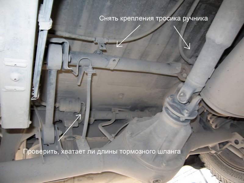 Домкратим... скидываем крепления: сапуна с кузова, тросиков ручного тормоза и сразу меняем тормозной шланг.