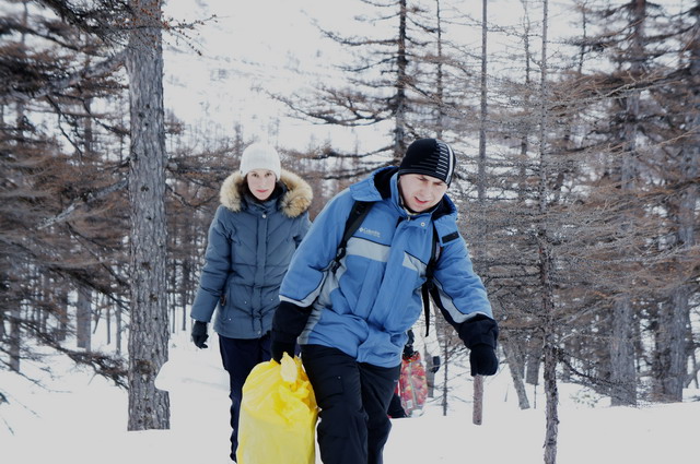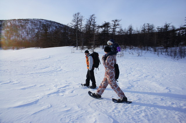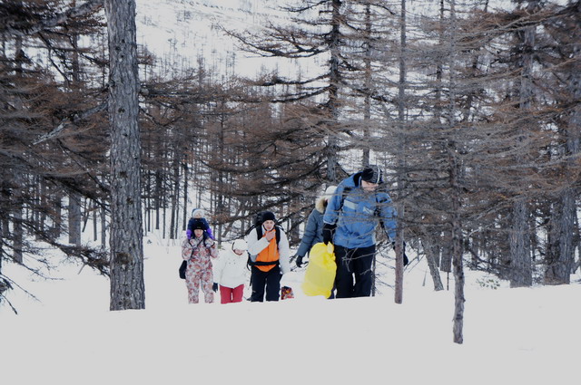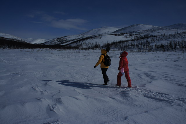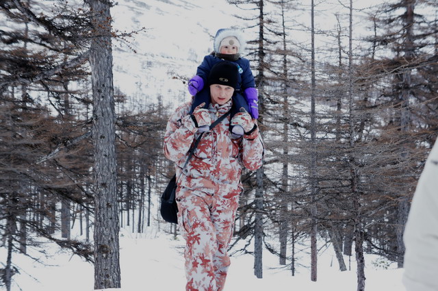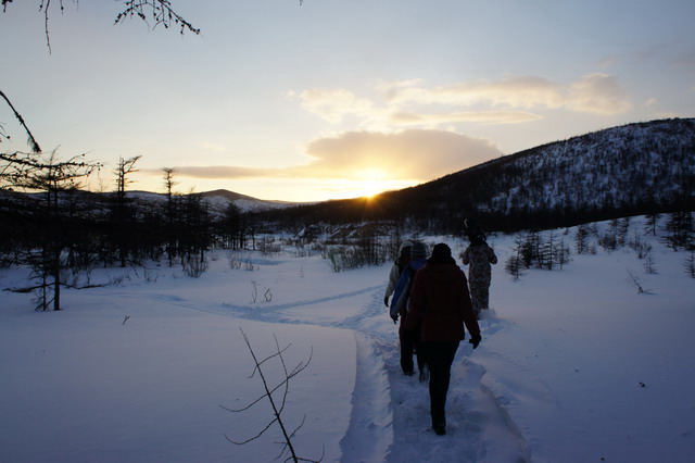 Вот вариант пешей прогулки без скучного возвращения по своим же следам: с Ольского перевала 6 км по дороге на д/о "Черный Ключ" и потом еще столько же по льду бухты Гертнера на "Горняк".