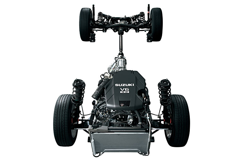 Теперь глянем, что собой представляет и откуда родом 3,2-литровый 6-цилиндровый агрегат. Напомню, что ранее аналогичная модель оснащалась V-образным мотором в 2,7, а не в 3,2 литра, как сейчас. Фактически среди машин класса light cross-country отечественного (японского) производства такого мощного — в 224 л.с. — двигателя нет больше ни у кого. Однако следует учесть, что задача Suzuki — поддержать свой высокий общемировой статус, так что подобный мощный мотор там, на мировой сцене, отнюдь не окажется лишним. Скажем, в Северной Америке с успехом продается автомобиль на платформе, разработанной инженерами GM (General Motors), который проходит как Suzuki XL7. Что он собой представляет? Это — SUV с тремя рядами сидений, длиной более 5-ти метров. Получается, что на сегодняшний день XL7 — самая большая машина, выпускаемая под маркой Suzuki. Так вот, этот новый 3,2-литровый мотор — не что иное, как заимствование у своего американского родственника. Правда, нельзя сказать, что его просто взяли и переставили с XL7 на 3.2 XS. Нет, предварительно ему уменьшили кубатуру, ведь американская версия этого V6 имеет рабочий объем 3,6 литра. Так что японский 3,2 литровый V6 — это еще что!
