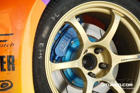 Носиться по дорогам общего пользования на безумных скоростях – задача не из самых легких. Подвеска Zeal была доработана специально для Option Stream Z Advance. Здесь используются амортизаторы с более длинным и жестким ходом, из-за которого манеру езды этой машины можно принять за свойственную тому классу, который называют «touring car». Этот Z не только хорошо вписывается даже в самые крутые повороты, но и хорошо себя чувствует на скоростных прямых. Суппорты Endless обеспечивают остановку за нужное количество времени и на таких показаниях спидометра, от которых волосы встают дыбом, а прототип Advan RG II, втиснутый в резину Pirelli P-Zero Asimetrico, вполне соответствует скоростным требованиям Silver State.