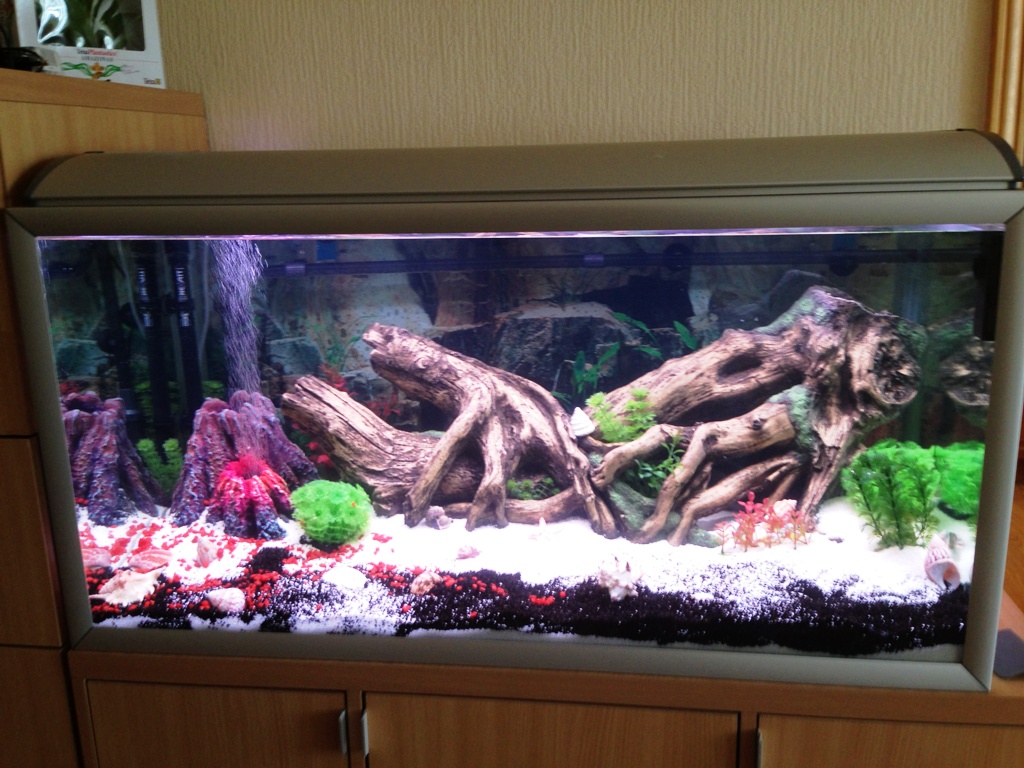 Ура! В полку аквариумистов прибыло, я наконец-то таки запустил свою первую банку...smile.gif Рыбки заедут завтра (хромисы), дизайн тоже еще требует доработки, надо Амазонки высадить на задний фон и с грунтом и мелкими растениями поработать... И поменять блок питания лед-посдветки гейзера, умудрился вчера его залить и спалить...sad.gif